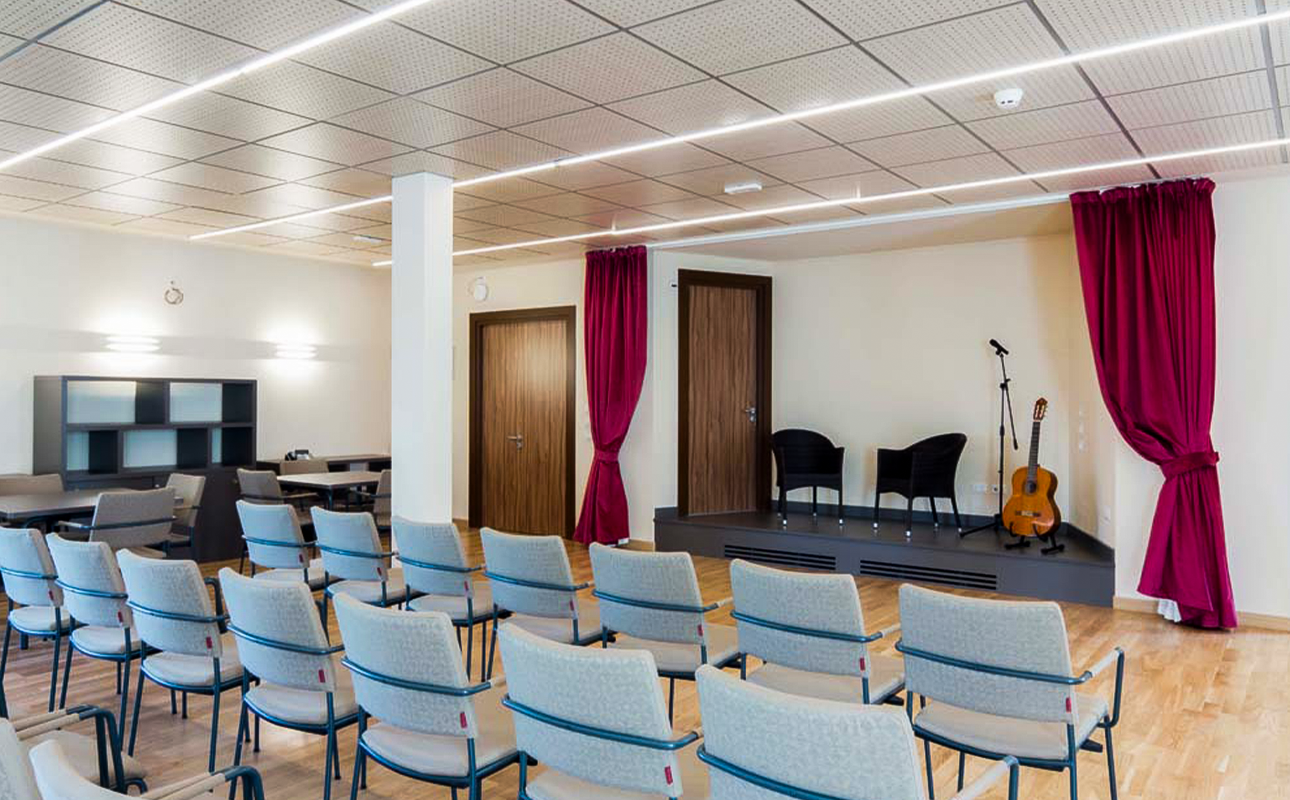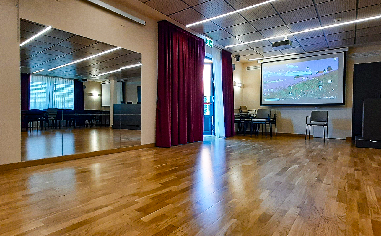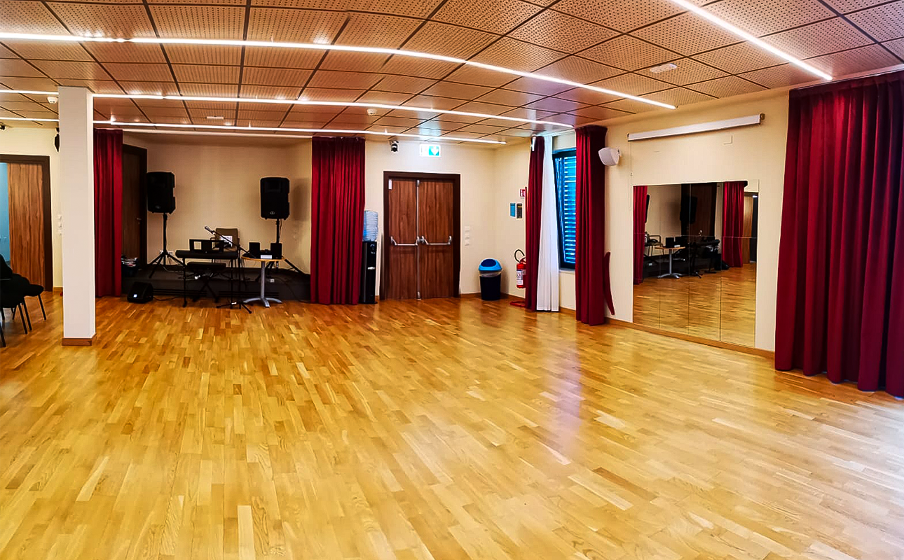 Uno spazio versatile che ospita eventi per i residenti e le famiglie, ma anche incontri pubblici su temi legati alla vita del Villaggio. Accoglie inoltre le attività del centro diurno Parkinson e, in base alle necessità, anche celebrazioni religiose.